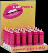 Hochwertiges Acryldisplay für 24 Lippenpflegestifte inkl. bedruckter Kartoneinschuber für Hintergrund und Vorderleiste